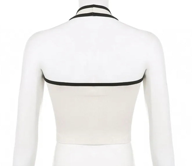 التصميم: قصّة هالتر بفتحة ظهر جريئة ولمسة ألوان متصادمة